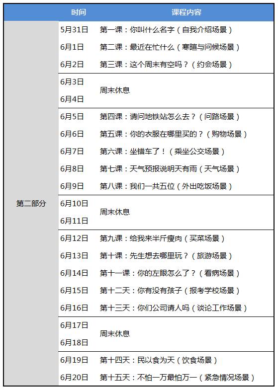 第二部分主要集中在粤语日常场景对话教学上,包含15个不同的日常场景高频对话,100+个高频词汇教学以及50+个常用句型,语法教学。配以每天大量口语练习,让你的粤语口语能够有进一步提升。