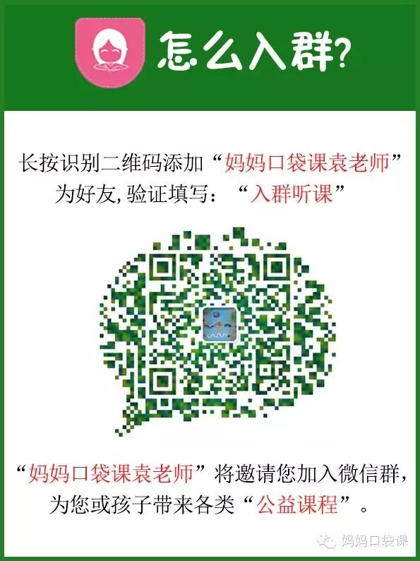 1、通过长按识别下面“妈妈口袋课”二维码(或通过查找微信号:mamakdk),进行关注(已关注可略去此步)。