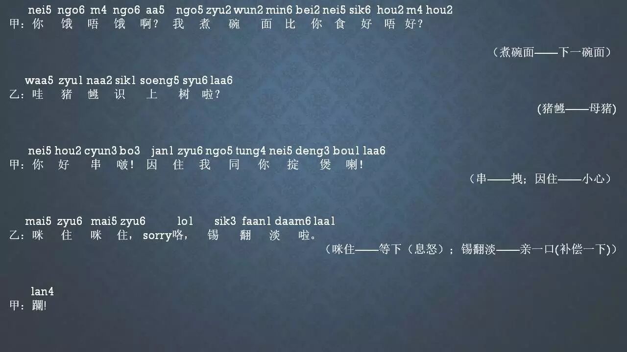在最开始的环节依旧是粤语音标,毕竟等到学好了音标,再飚几句粤语撩妹岂不是美滋滋~ 。这次的音标环节仍然有有趣的歇后语和绕口令哦~