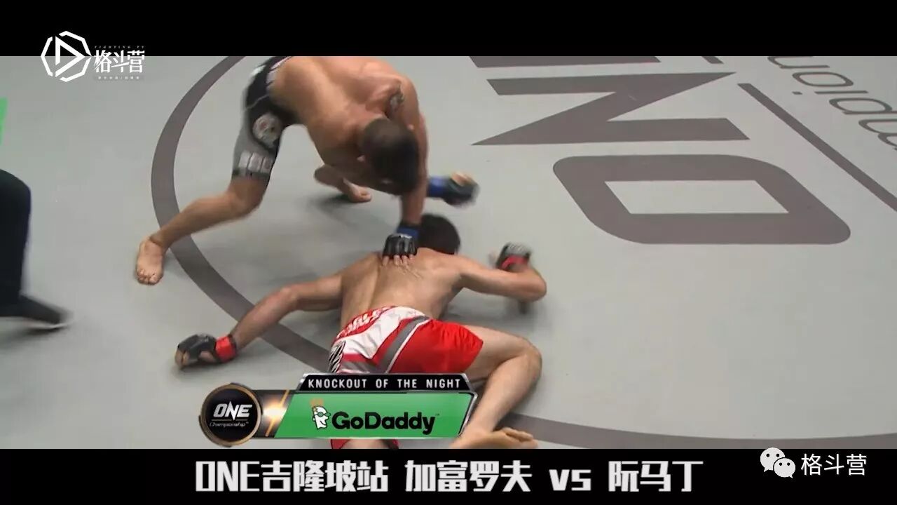 ONE冠军赛吉隆坡站,俄罗斯的不败冠军加富罗夫迎战新星阮马丁。这也是两人的二番战,第一次交手时加富罗夫仅用41秒便轻松降服马丁,而这一场马丁赛前更是不被人看好!比赛中加富罗夫牢牢占据优势,多次险将马丁终结。在比赛第二回合,马丁不断调整节奏,抓住加富罗夫的进攻漏洞,一记后手摆拳将其击倒,紧跟着几记重重的地面砸拳直接结束比赛。这一场精彩的逆转之战堪称ONE冠军赛史上的最大冷门,马丁也如愿以偿成为了新的ONE羽量级世界冠军!