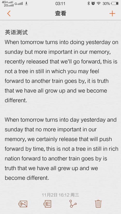 英文测试原文样本:When tomorrow turns in today, yesterday, and someday that no more importantin in our memory, we suddenly realize that we are pushed forward by time. This is not a train in still in which you may feel forward when another train goes by. It is the truth that we’ve all grown up. And we become different.