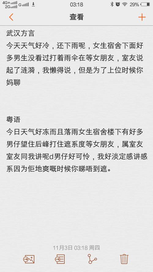 方言测试原文样本:今天天气好冷,而且下雨了。女生宿舍下面好多男生冒着寒风,打着雨伞在等女朋友。