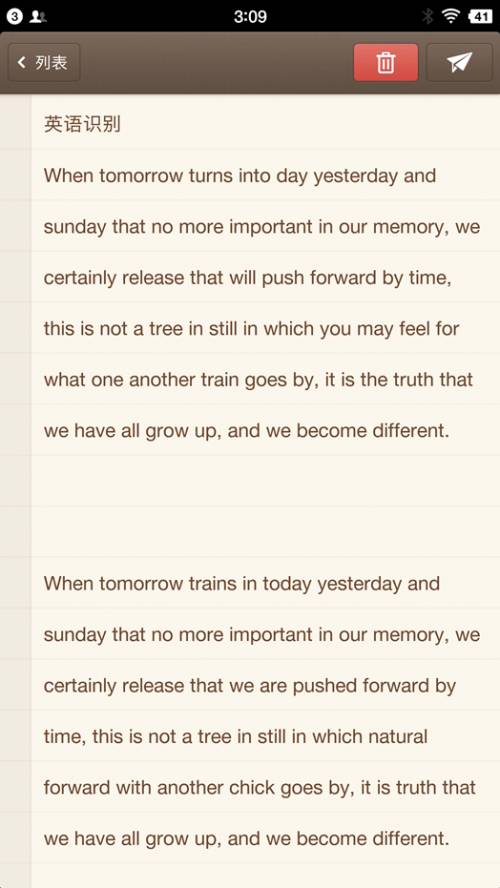 从英语识别显示结果上看,准确率有一些挺离谱,在英语发音标准达到英语6级的口语水平测试下,同样的发音以及语速的录音,有很多单词识别的很有反差,苹果错了10%的单词,安卓错了15%的单词,而锤子仅仅错了8%的单词。通过识别率由此可见,锤子定制版的讯飞语音输入法还是有一定的深度优化的,不过反复测试了5遍每次结果不是一样的,看来机器识别还是有误差所在,依然没有自动识别标点符号。