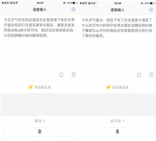 这次方言测试,公司有本土当地粤语、武汉话的同事,选择这两种方言进行了测试,而且该粤语、武汉话都在讯飞语音输入法的能力范围当中。经过多次测试已经逗笑了笔者很多次,识别水平比有的内涵段子还精彩百出。