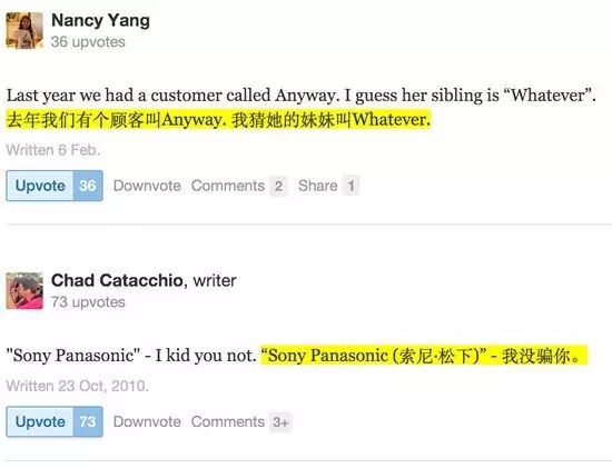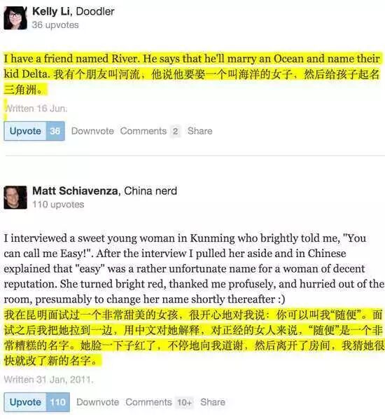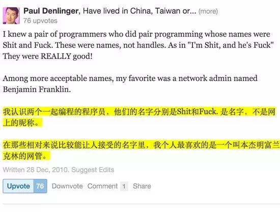 Quora是一个问答SNS网站,由Facebook前雇员查理·切沃(Charlie Cheever)和亚当·安捷罗(Adam D' Angelo)于2009年6月创办。在2009年12月推出测试版,随后在2010年6月21日向公众开放。国内的知乎就是模仿它的模式。知乎上也有很多有有趣的内容,但Quora的用户来自世界各地,所以能够看到一些和中国人不太一样的视角和思维方式,这是它比较有意思的地方。1、很多中国人用自己喜欢的某种事物、或者和中文名字意思或读音相近的单词给自己命名,但这些词在英文里并不是名字,这一点给许多老外造成了很大困扰。比如Apple, Phoenix, Dragon, Happy, Sunny等,其实换位思考下就很好理解,如果一个老外给自己起中文名字叫苹果或凤凰,中国人大概也接受不了。北京的一个老外朋友叫“金玉米”,因为他的英文原名叫Jeremy Goldkorn,初次认识时就让人感到很滑稽。2、还有人喜欢用神话传说或者小说人物给自己命名,比如有国人取名叫希腊神话里的女妖美杜莎Medousa,给人的心理观感就和中国人听到一个老外给自己取中文名字叫梅超风差不多。另外,如果你不想听到有一个叫“葫芦娃”的老外,那最好也别给自己起个英文名字叫Harry Potter.3、香港人有自己一套非常有地域文化特色的命名体系,已经成为一个亚文化现象。香港人或者自己生创出根本不存在的单词,或者根据自己名字的粤语发音挑选单词(比如周润发叫Chow Yun-fat,相比之下成龙叫Jacky Chan真是业界良心)。