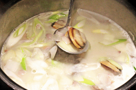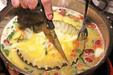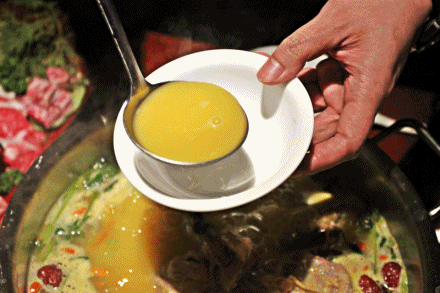 涮完菜,撇清锅里的杂质