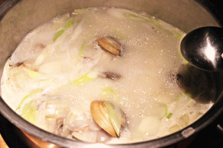 锅底放入花蛤、牛肉、大葱、洋葱