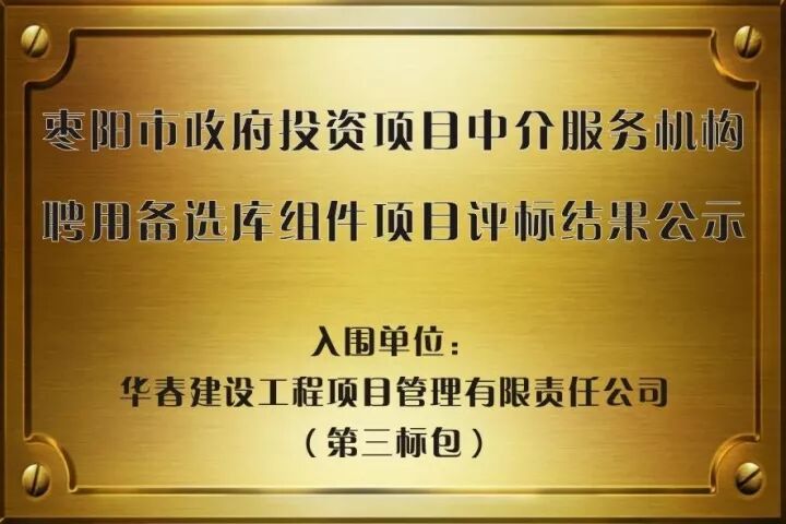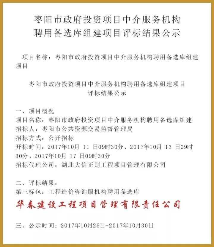 2017年10月11日、13日、17日, 湖北大信正则工程项目管理有限公司受枣阳市公共资源交易监督管理局的委托,依据枣阳市人民政府文件枣政发[2013]4号《关于枣阳市政府投资项目中介服务业务监督管理暂行办法》要求,分别就枣阳市政府投资项目中介服务机构聘用备选库组建进行公开招标,经评标委员会评定,招标人确认,确定华春公司成功入围枣阳市政府投资项目工程造价咨询服务机构备选库。