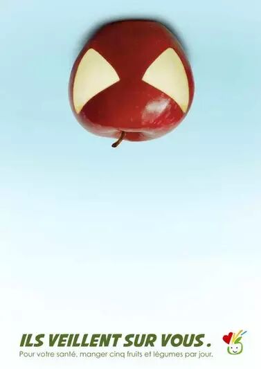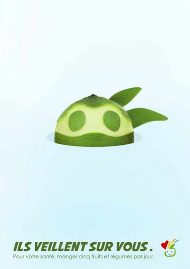 法国PNNS公益广告:一组欣赏性和趣味性都不错的平面系列。苹果原来是蜘蛛侠,青柠变身忍者神龟,茄子是扣了帽子的蝙蝠侠,你们会不会藏得太深了!