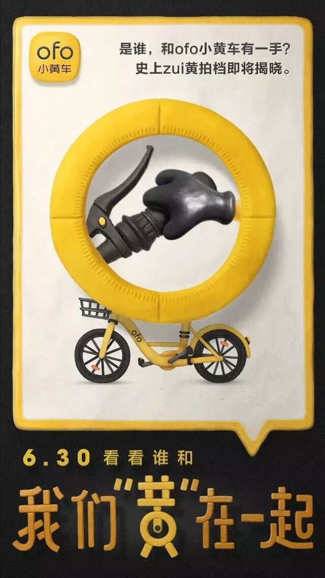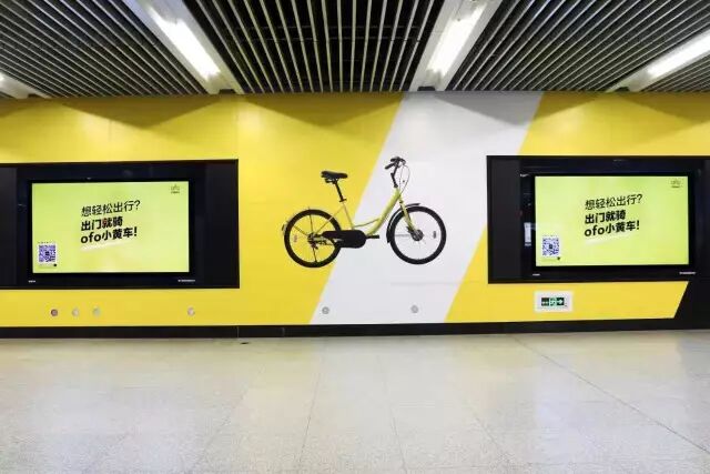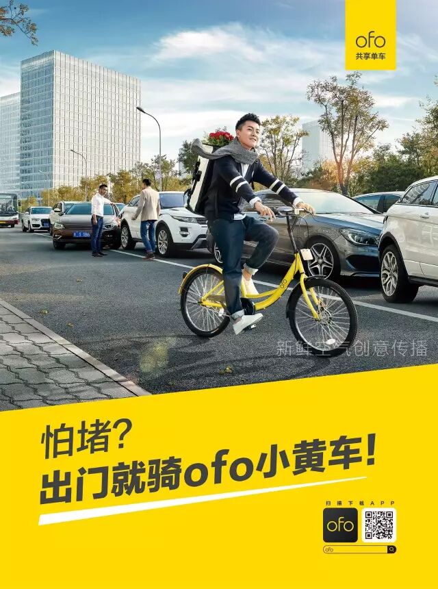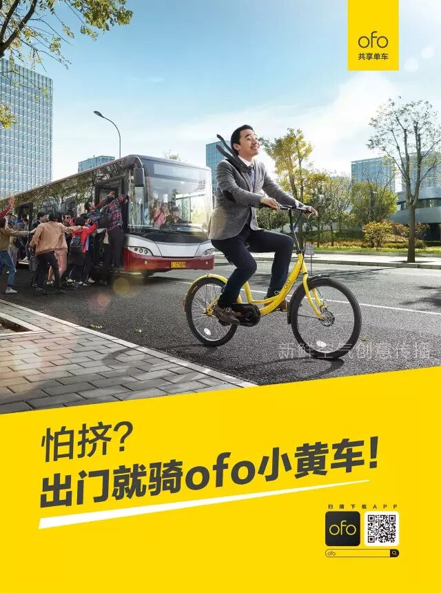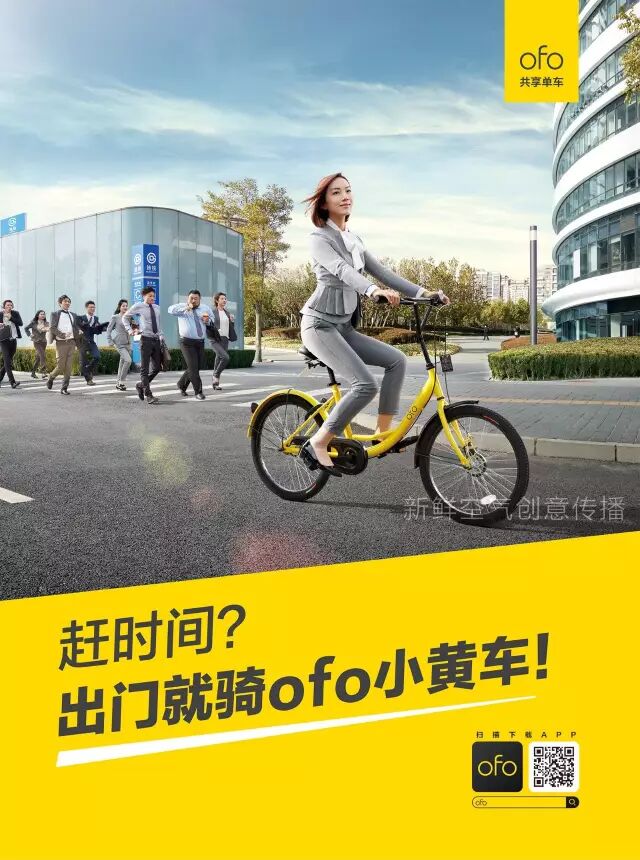 这是ofo做的第一轮大面积推广,广告内容也很简单,场景化+产品记忆点,其实就是为了让消费者知道在什么情境下可以使用共享单车,而共享单车最大的优势就是方便、自由度高,而且记得要使用“黄的那个”。