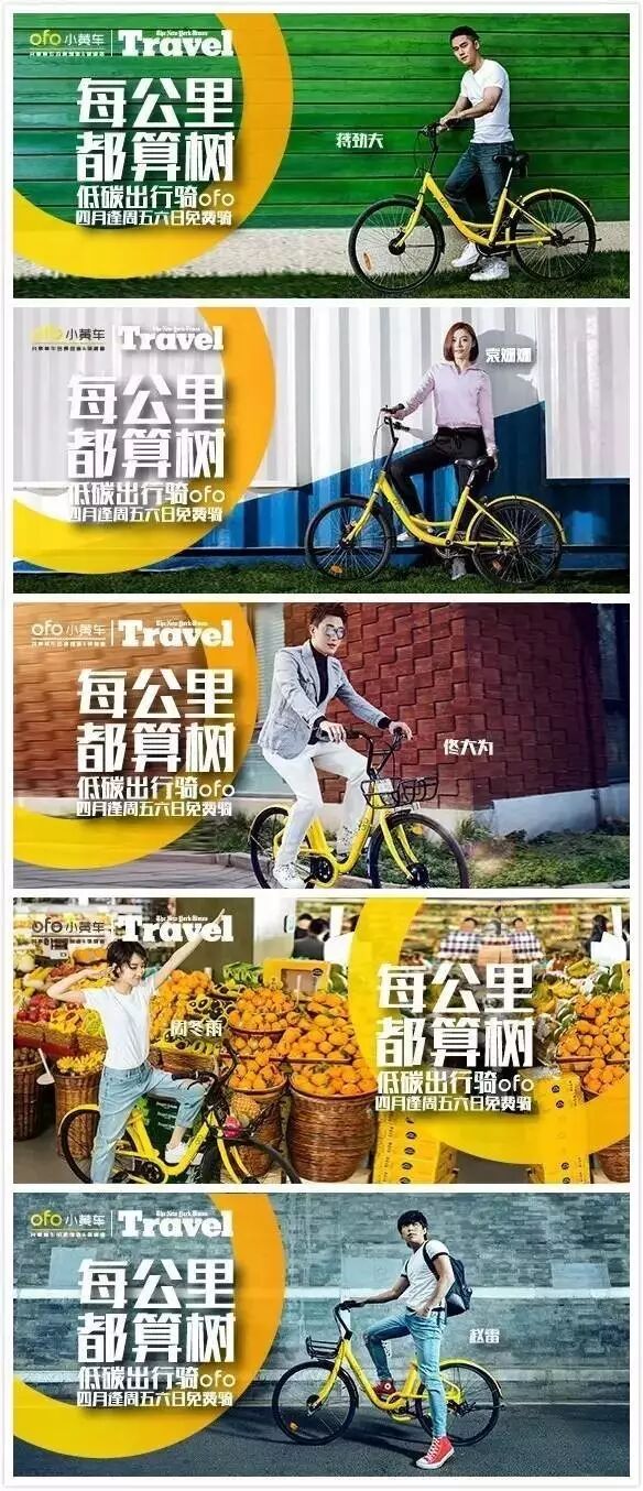 ofo在今天4月份推出了一项低碳骑行活动——“每公里都算树”,将ofo塑造成了一个绿色公益的品牌形象,并请来了佟大为、周冬雨、蒋劲夫、袁姗姗、赵雷等一众明星做宣传,单凭这些明星本身自带的明星效应也能知道这波宣传影响力不会太小。
