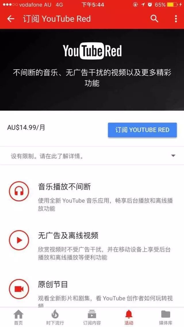 贴心小提醒:订阅YouTube Red $14.99一个月,新用户可以免费享受YouTube Red一个月。如果开通了记得去设置里关掉自动续费哦~