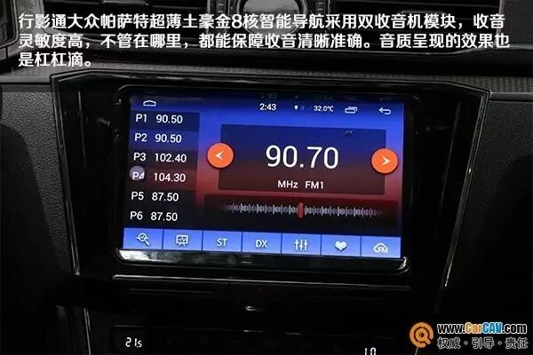 行影通大众帕萨特超薄土豪金8核智能导航采用双收音机模块,收音灵敏度高,音质呈现的效果也是杠杠滴。