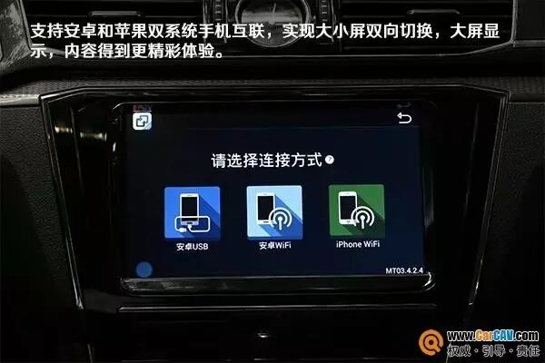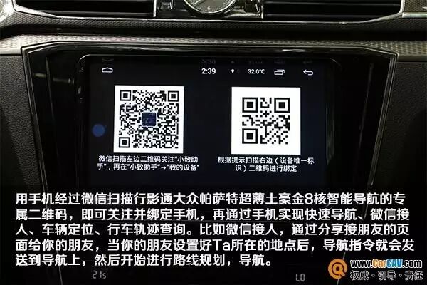 用手机经过微信扫描行影通大众帕萨特超薄土豪金8核智能导航的专属二维码,即可关注并绑定手机,再通过手机实现快速导航、微信接人、车辆定位、行车轨迹查询。比如微信接人,通过分享接朋友的页面给你的朋友,当你的朋友设置好Ta所在的地点后,导航指令就会发送到导航上,然后开始进行路线规划,导航。此外,支持安卓与苹果进行与车机互联,大小屏之间随心切换。