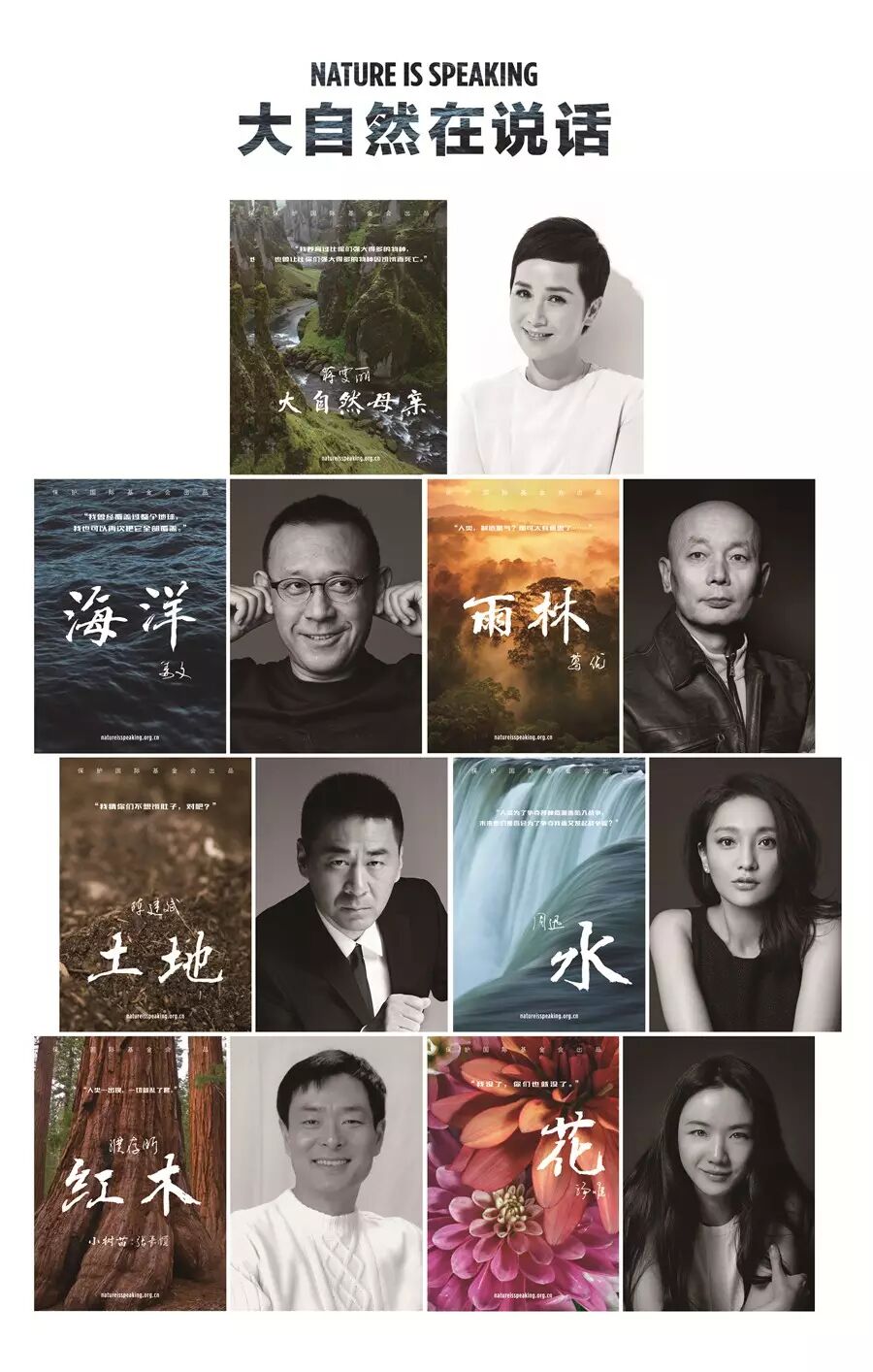 “大自然在说话”是一套公益影片,由影人为大自然发声,国际版为茱莉亚·罗伯茨、爱德华·诺顿在内的七位重量级好莱坞大腕配音,中文版则由蒋雯丽、姜文、葛优、陈建斌、周迅、濮存昕、汤唯,分别“演绎”大自然母亲、海洋、雨林、土地、水、红木、花。通过他们的声音,让人类倾听大自然的所知所见,更重要的是,倾听大自然给予人类的建议。