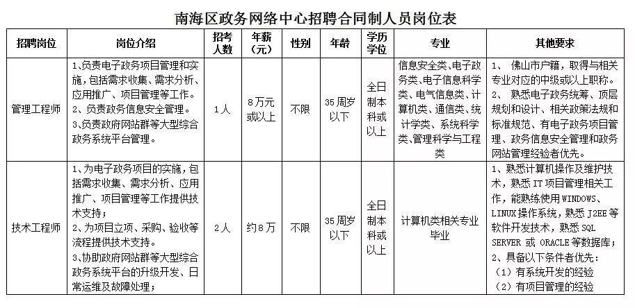 南海区政务网络中心根据工作需要,现面向社会公开招聘合同制人员3名。