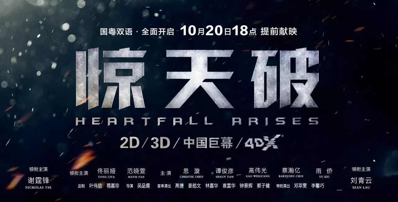 《惊天破》由谢霆锋、刘青云、佟丽娅、范晓萱领衔主演,思漩、谭俊彦、高伟光、蔡瀚亿等主演,更有高捷、邓萃雯等戏骨客串、特别出演,叶伟信、禤嘉珍监制,吴品儒执导。据悉,影片将于10月20日(本周四)下午18时正式登陆全国院线。