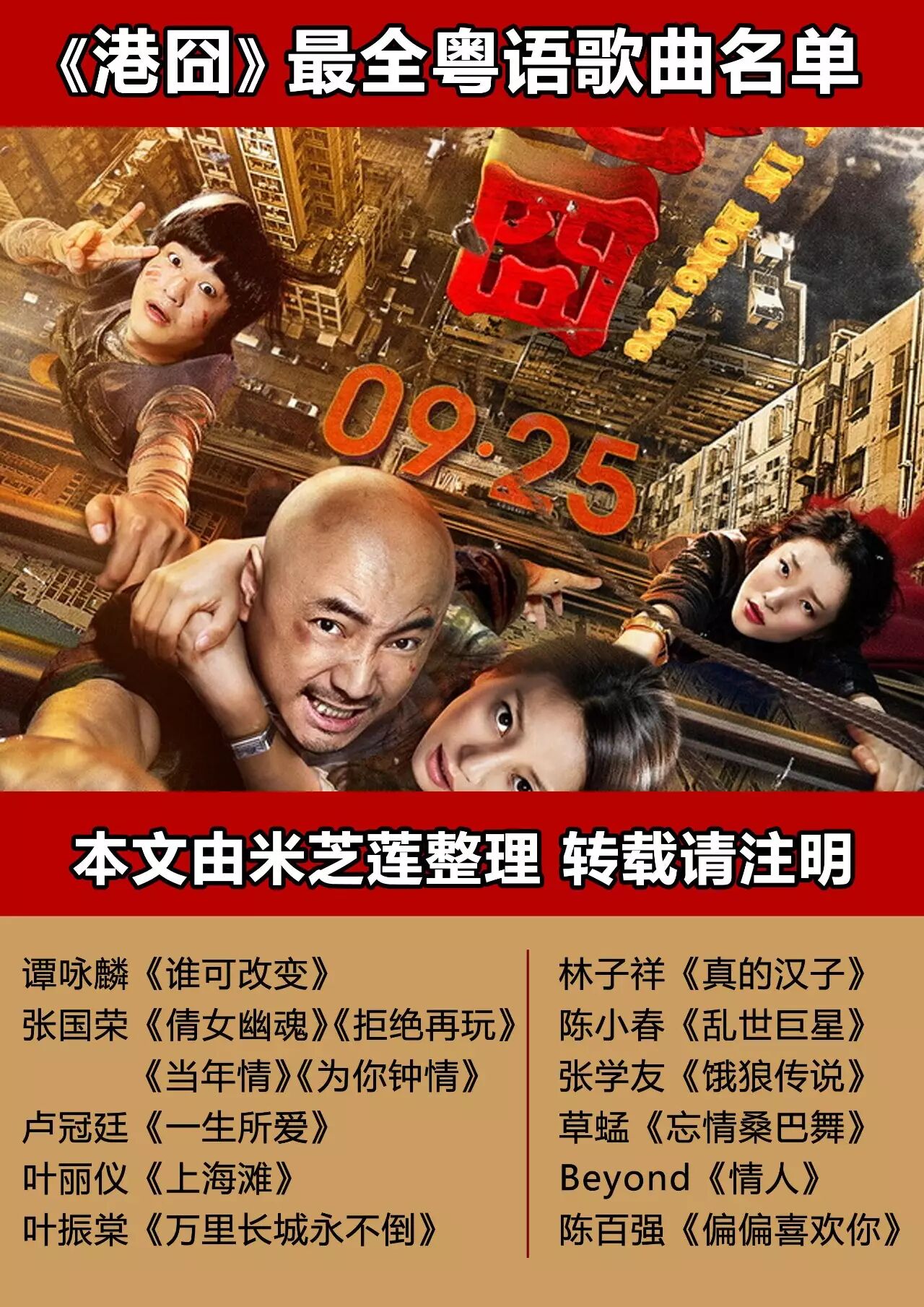 徐峥导演这次在《港囧》里搞了一次“粤语老歌大串烧”,据说《港囧》光是购买音乐版权就花了7位数,从谭咏麟到张国荣再到陈百强,从草蜢到Beyond,网罗了不少80、90’s的粤语金曲。所有歌曲都是根据情节和情绪决定的,所以这些表面上像是大串烧的歌曲,其实每一首都是很有用意的,下面就一起慢慢聊聊里面的这些歌曲的背景。