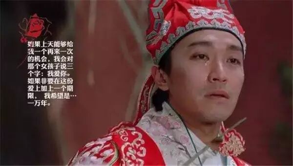 “曾经有一份至真的爱情摆在我面前,但我没有去珍惜,到失去的时候才后悔莫及,尘世间最痛苦莫过於此。如果上天再给我一次机会,我会跟那个女人说我爱她;如果非要给这份爱加上一个期限,我希望是一万年。”