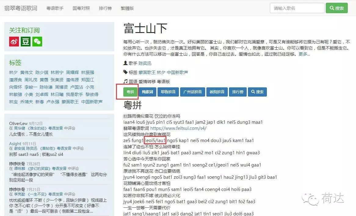 这个网站为大多数粤语歌词配上粤语拼音,例如《富士山下》,歌词如下图:
