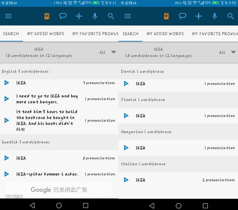 在搜索框中输入“IKEA”,我们可以看到,对于“IKEA”的读音就有12中语言。除了有英语读音还有瑞典语、丹麦语、意大利语、芬兰语、匈牙利语等一些母语发音(很是贴心啊),而且除了单词以外,还有包含该单词的简单的短语发音。