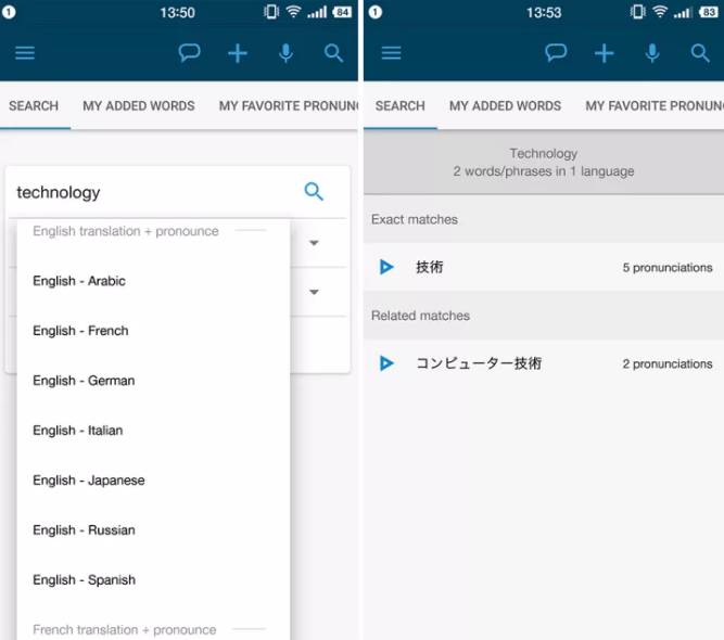 除发音功能外,在搜索界面的下拉菜单中选择翻译发音选项(translation + pronounce),可以对你输入单词进行翻译以及发音。
