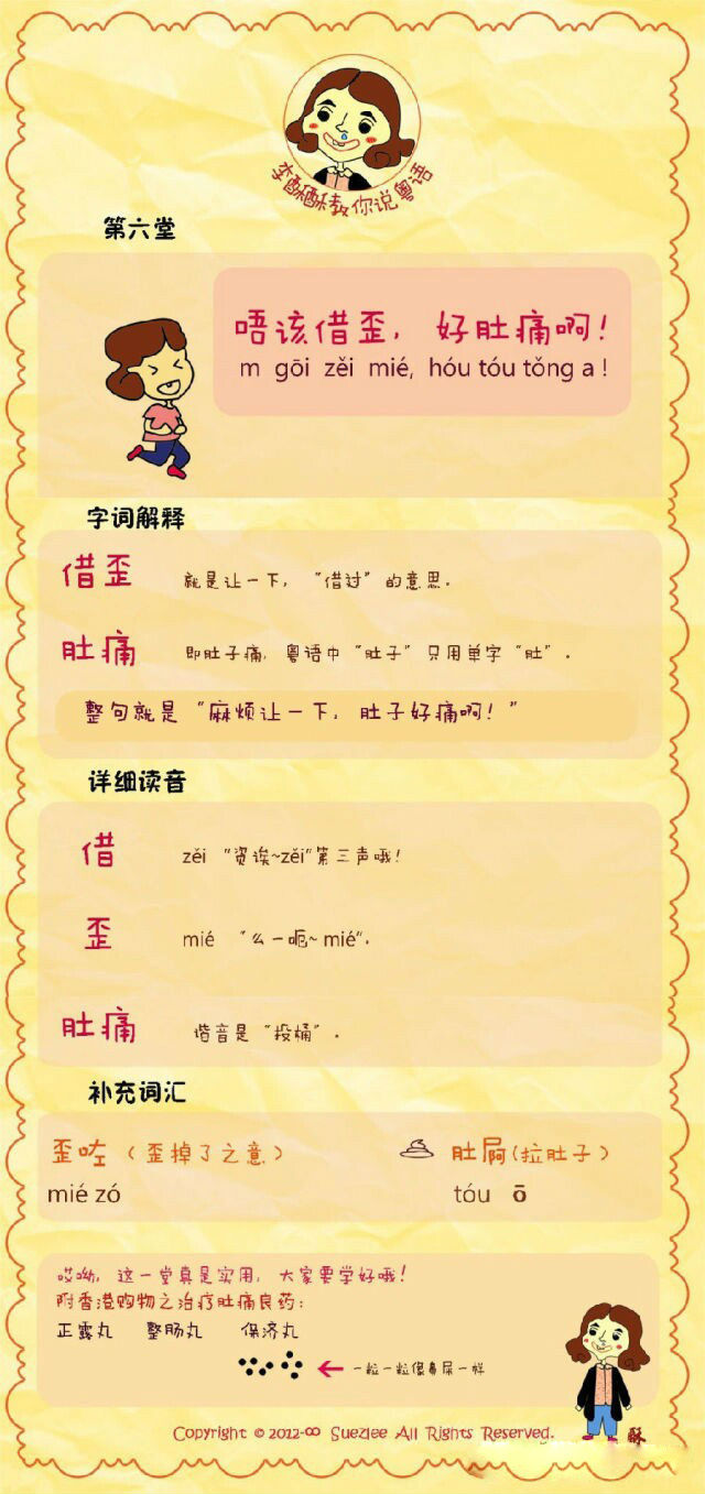 唔该借歪,好肚痛啊!(麻烦借一下,肚子好痛啊!)