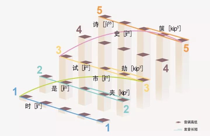 粤语的“古色古香”更体现在语音方面。现代广州年轻人所讲的粤语,依然存在九调,如“诗”“时”“史”“市”“试”“是”六个字,声母与韵母完全一样,但声调分别是阴平、阳平、阴上、阳上、阴去、阳去六种声调,因此广州人一听就知道是六个不同的字。这可以比喻为字音在五线谱上的舞蹈,不通此道的人则很难感受其中的美感。