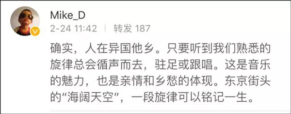 据歌手说@小海南刺青 说,她哭的很伤心,唱完我问她,才知道她嫁来日本16年,很思念祖国。她没想到我一个中国人,会漂洋过海到日本东京街头去表演,这让她很感动。
