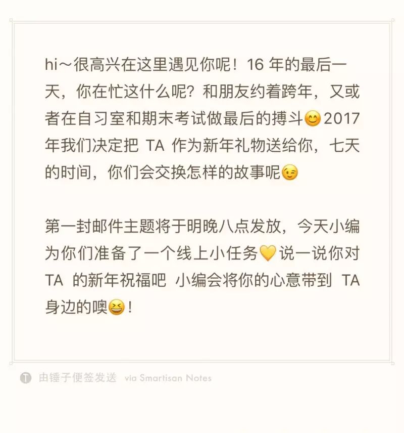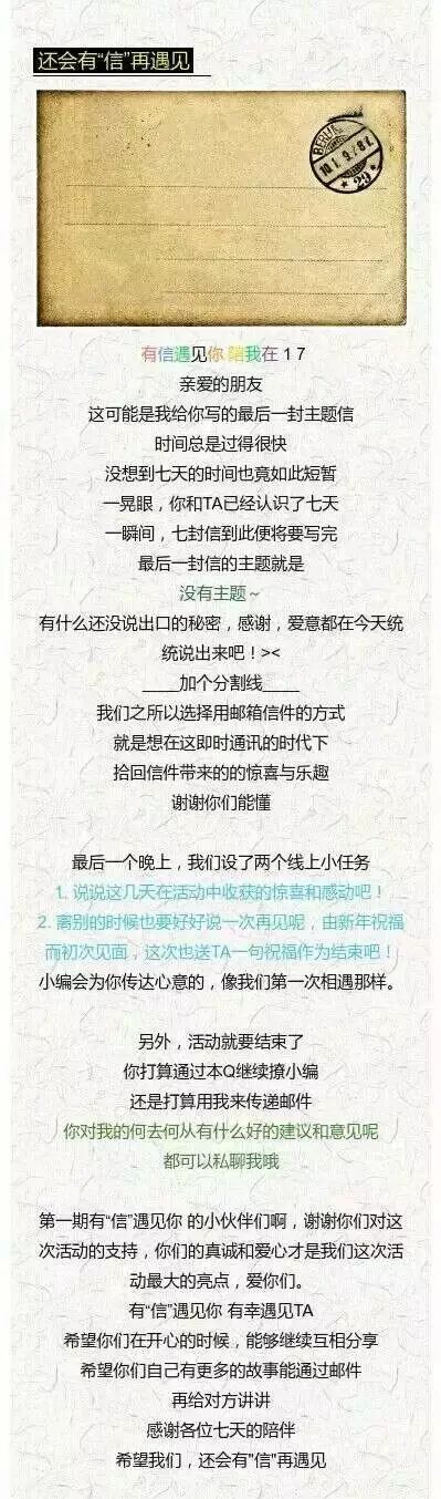 最后给他的祝福就是:很高兴有“信”遇见一个从未谋面的你,做了七天的知心朋友哈哈,希望你在新的一年里开开心心的,做自己想做的事,一切都变得更幸运![]()