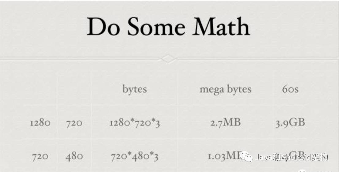 那我们可以开始做点算术题了,假设一张像素为1280X720(清晰度,宽1280个像素点,高720个像素点)的图片,大小为约为1280X720X3 bytes,就是2.7MB。