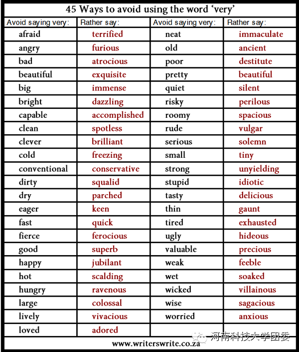 避免用very这个单词。这大概是英语中最被滥用的单词,因为very用于强调动词、形容词和副词都是很方便的。但是,用一个单词来清晰地表达你的想法,会让你显得更聪明哦!
