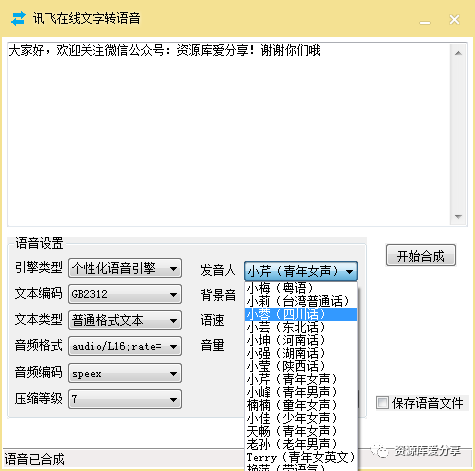 2发音人:中文或者英文合成引擎只能选择男生或者女生发音,大家在引擎类型处先选择个性化语音引擎,然后在发音人哪里就出现了很多选项了,粤语、普通话、四川话、东北话、陕西话等等