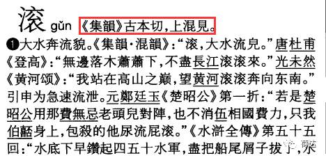 “滚”字或“滾”字,在韵典网、汉典、poem大的《广韵字音表》、郭锡良《汉字古音手册增订本》里一概没有收录。《汉语大字典》里以“滚”字为字头,它的正版反切来自《集韵》:古本切。