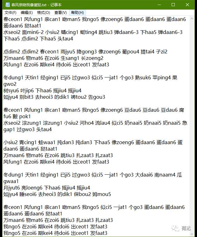 歌词里有一个词汇,暂时使用“㿺”字标记pok1音,“豆腐㿺” (dau6 fu6 pok1)(豆腐泡)。