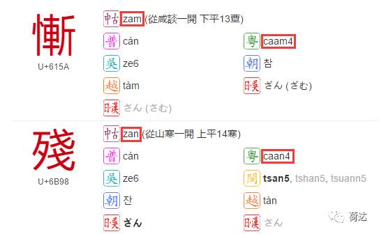 下图反映了“惭”是m韵尾,闭口音,读caam4,“残”是n韵尾,开口音,读caan4。