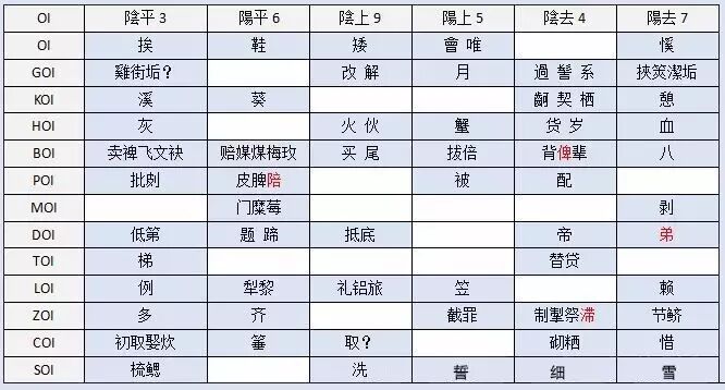 为了便于理解,下面以OI韵为例,黎话口语中发音为OI韵的字整理如下,共有106个,个别不确定发音的以红色字样标识;