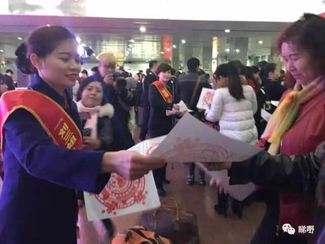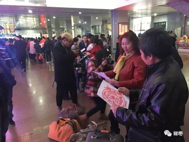 此外,记者还在现场看到,火车站组织了专门的引导员以及服务队,引导乘客购票、乘车、进站。火车站还给乘客们分发了剪纸,祝福旅客们路途平安、新春愉快。