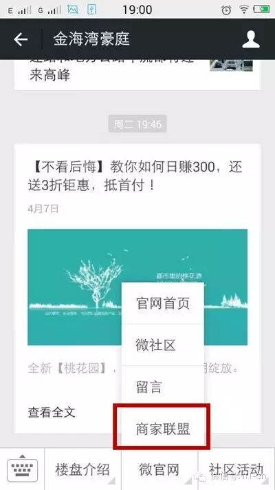 欲了解详细商家名录及对应优惠,关注金海湾豪庭公众微信号(qyjhwht),在第二个菜单上找到“商家联盟”(如下图所示),点击进去即可查阅!