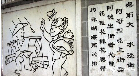 落雨大,水浸街,阿哥担柴上街卖,阿嫂出街着花鞋。