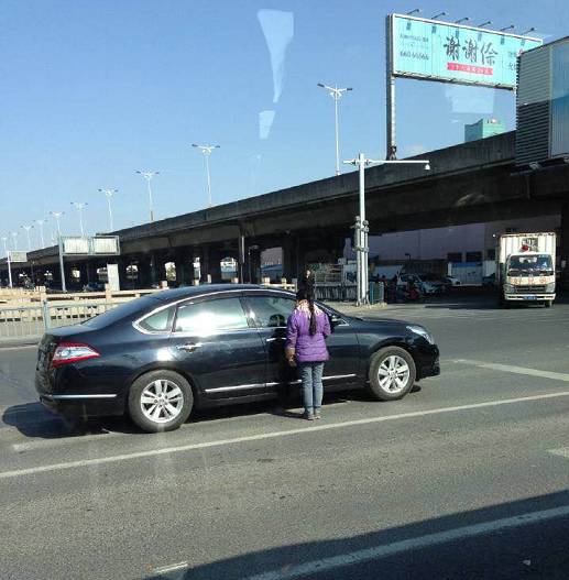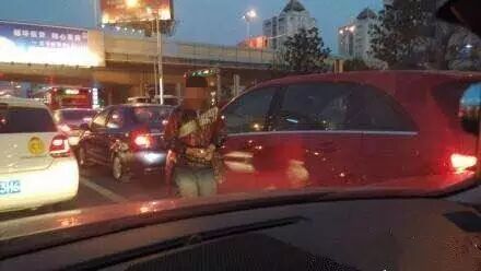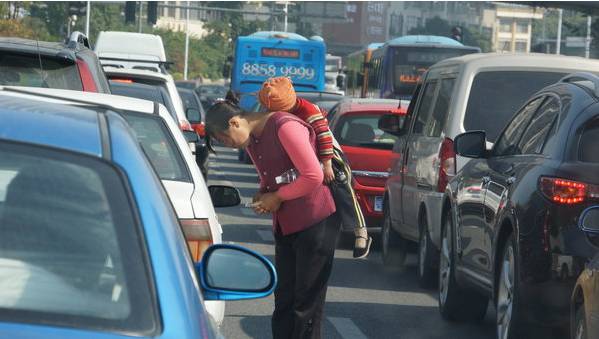 要是遇到了比较好的车,男孩子不仅会拉车门敲车窗,还会配合同行的女子拦在车头。可见对于乞讨这份工作,男孩相当有经验,但这些行为和他的年纪显然是不相符的。