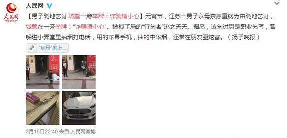 原来行乞的男子平时穿着体面,用的是苹果手机,抽的是中华烟,有自己的私家车,还常在朋友圈炫富,一点也不贫困!