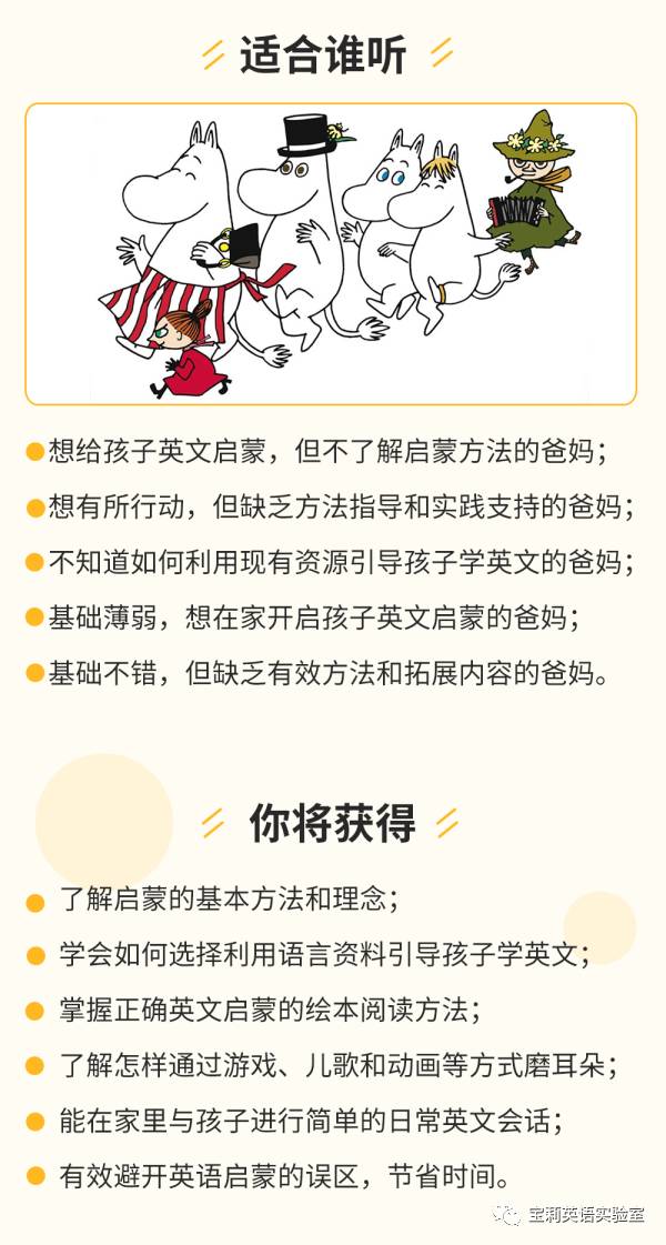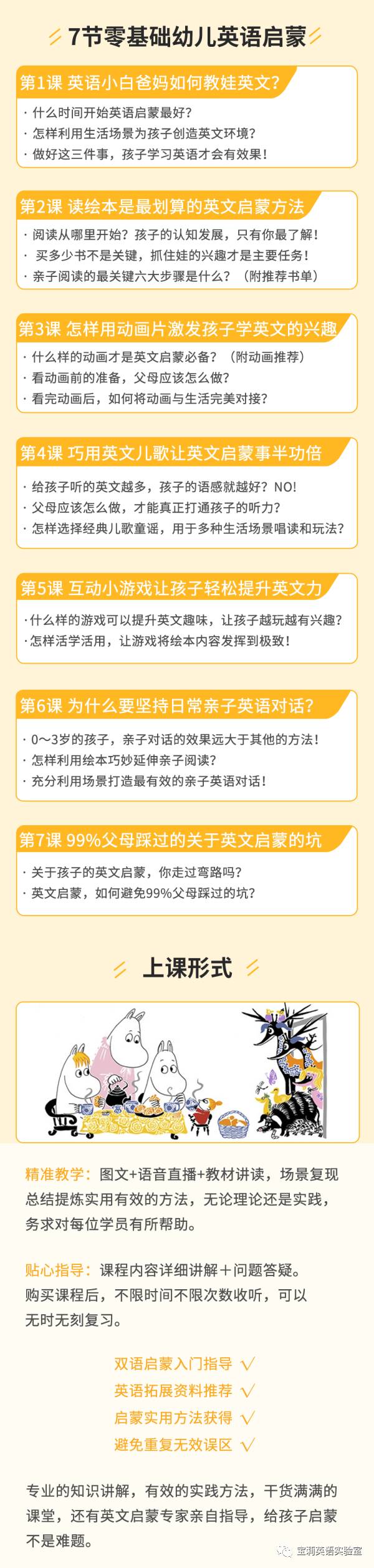 所以宝莉爹此次结合过往家庭双语启蒙的经验,给父母们带来了英文启蒙系列课《7节课轻松开启幼儿英语启蒙,每个妈妈都能胜任》。