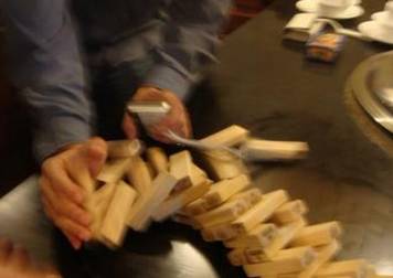 【举例】积木叠成咁,掹走一条一定冧啦(这些积木这样叠,抽走一根一定倒啦)