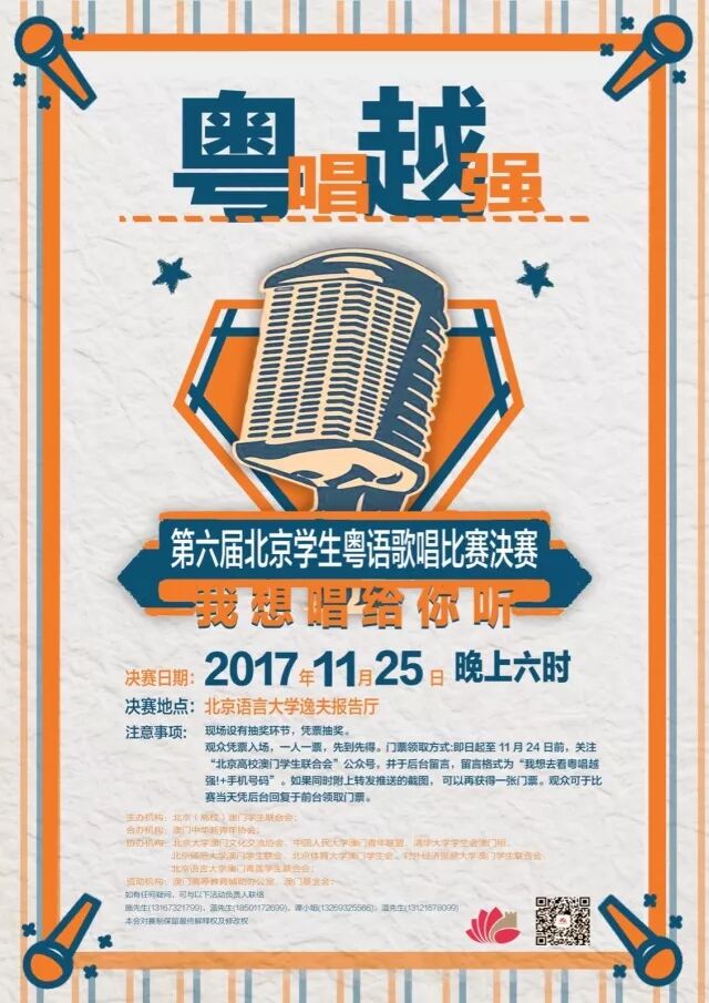 即日起至 11 月 24 日前,关注“北京高校澳门学生联合会”公众号,并于后台留言,留言格式为“我想去看粤唱越强!+手机号码”。如果同时附上转发推送的截图, 可以再获得一张门票。观众可于比赛当天凭后台回复于前台领取门票。
