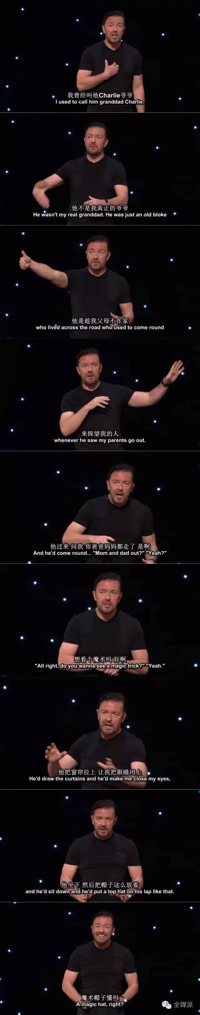 最后推一个腐国大拿,主持过奥斯卡的Ricky Gervais。讲得一口非常毒舌,非常没下限,非常低俗,非常黄暴,非常在理的单口。