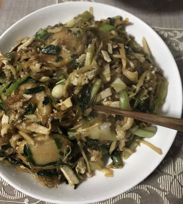 六、将番薯面与切成丝的青菜、香干、油豆腐、笋、五花肉放入锅中翻炒;