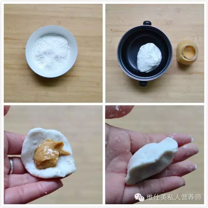 2.取一点面团,中间压小窝,包入适量的花生酱,捏口,再揉圆即可。