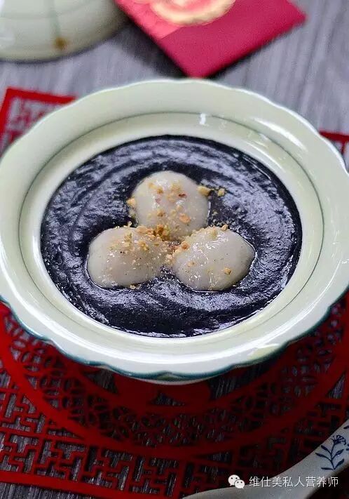 3.将杂粮糊倒入碗里,再放上事先煮好的汤圆,一碗香喷喷的养生汤圆,送给我最爱的妈妈。