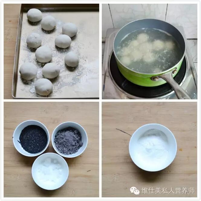 4.锅内放入适量的水,大火烧开后放入包好的汤圆,中火煮至汤圆全部浮起来就是成熟了,中途要用勺子转圈,以防止汤圆粘底哈。
